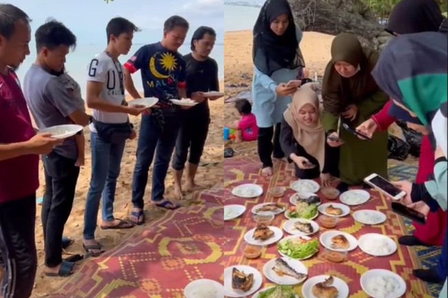 Momen itu terjadi saat sekelompok istri dan suami ini sedang melakukan piknik di pinggir pantai. Makanan yang mereka bawa di antaranya ada ayam bakar, ikan goreng, dan sayuran. Makanan-makanan itu disajikan di atas alas tikar.