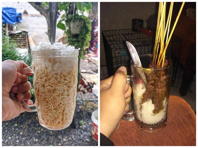 Uniknya bukan menggunakan piring atau mangkuk, netizen ini justru memilih untuk makan di dalam gelas. Sekilas tumpukan mie instan dan nasi ini terlihat seperti minuman kekinian dengan whipped cream di atasnya.