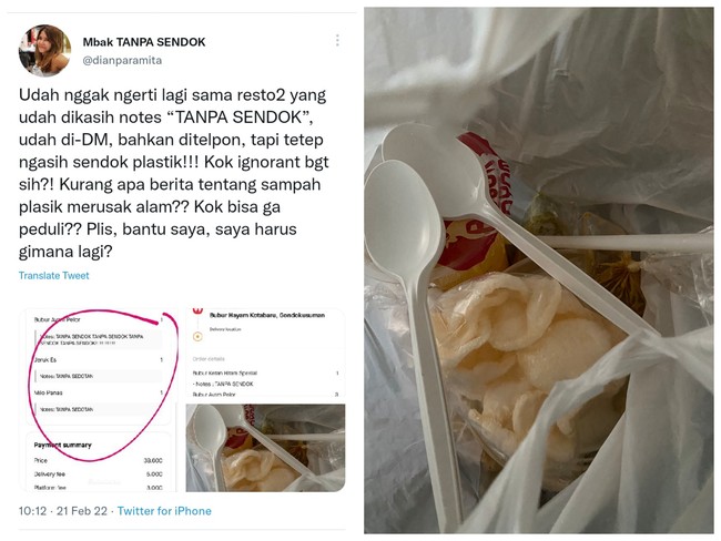 "Udah nggak ngerti lagi sama resto-resto yang udah dikasih notes "TANPA SENDOK", udah di-DM, bahkan ditelepon tapi tetep ngasih sendok plastik!!! Kok ignorant banget sih?! Kurang apa berita tentang sampah plastik merusak alam?? Kok bisa ga peduli?? Plis, bantu saya, saya harus gimana lagi?" tulis Dian dalam cuitannya.