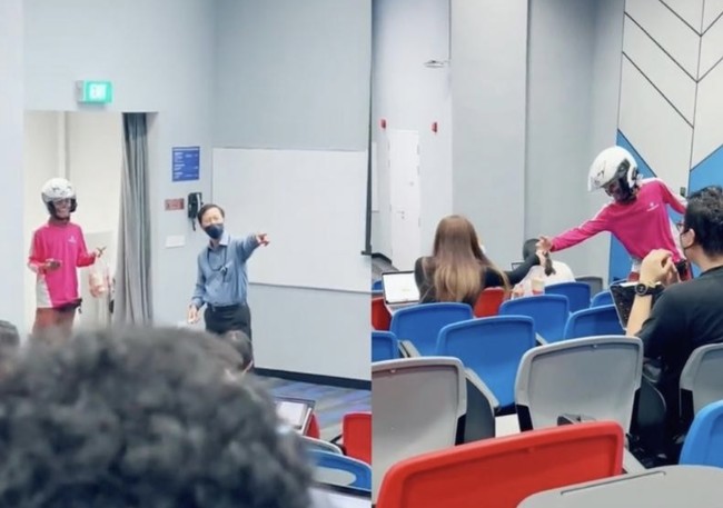 Ko memperlihatkan seorang pengantar makanan yang mengenakan kaus pink kebingungan memasuki kelas di kampus. Ia tampak mengenakan helm dan menenteng satu plastik pesanan makanan di tangannya.