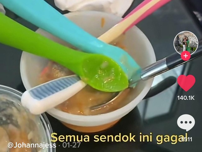 Video yang dibagikan oleh pengguna akun TikTok @johannajess ini memperlihatkan aksi unik yang dilakukan ibu saat menyuapi makanan untuk bayinya. Sang bayi terlihat ogah-ogahan saat disuapi makanan menggunakan sendok makan bayi yang berukuran kecil.