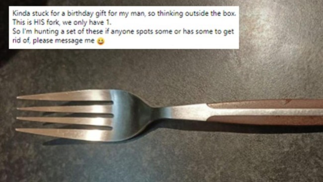 "Saya kesulitan mencari hadiah ulang tahun untuk suami saya, jadi saya mencoba berpikir sesuatu yang unik. Ini adalah garpu miliknya, dan kita hanya memili satu saja," tulisnya, lengkap dengan foto garpu tersebut.