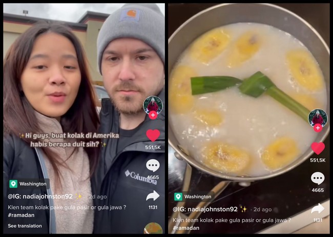 Mengutip TikTok @ignadiajohnston92 (13/4/2022) atas seizinnya, Nadia menunjukkan dirinya tak bisa lepas dari makanan buka puasa khas Indonesia. Ia membuat kolak pisang dengan bahan-bahan yang ada di supermarket setempat.