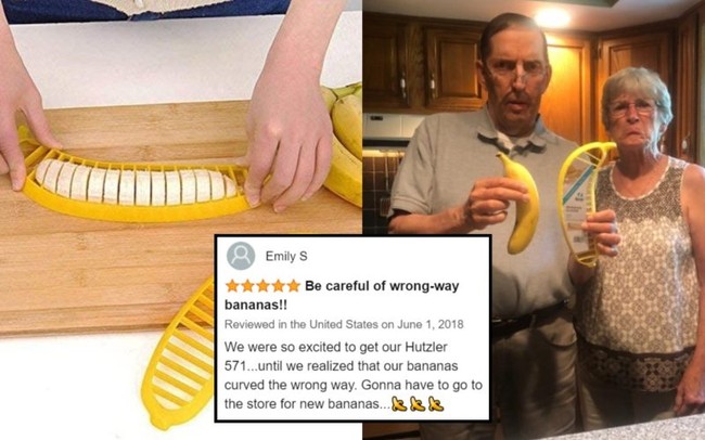 "Kami membeli alat pemotong pisang ini, sampai kita baru sadar bahwa bentuk pisang saya ukuran dan arahnya berbeda. Jadi saya harus pergi ke toko buah baru, untuk cari buah pisang baru yang sesuai," canda pembeli lainnya, namun tetap memberikan rating bintang lima.