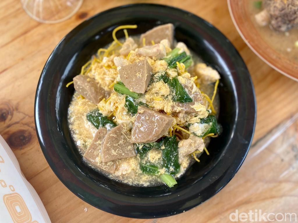 Mienya digoreng garing, kemudian diberi kuah kental dengan aneka topping. Ada ayam, bakso, dan sayuran. Rasanya gurih dengan tekstur yang renyah pada mienya.