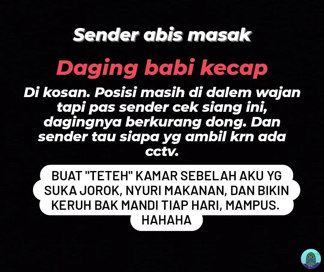 "Sender abis masak daging babi kecap. Di kosan, posisi masih di dalam wajan, tapi pak sender cak ciang dagingnya berkurang dong. Sender tau siapa yang ambil karena ada CCTV," tulisnya.