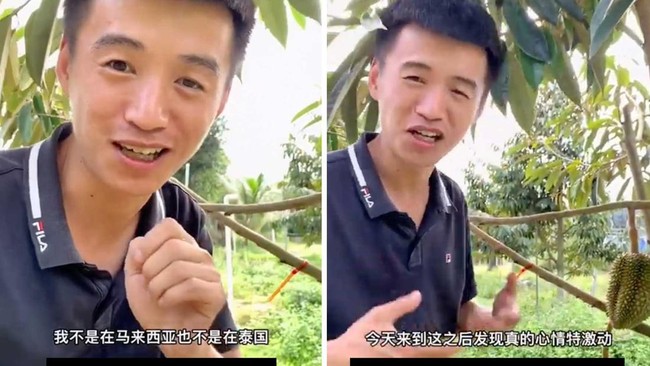 Dari video yang diterbitkan China Press, tampak seorang pria tengah berkeliling di kebun durian yang ada di Provinsi Hainan, China.