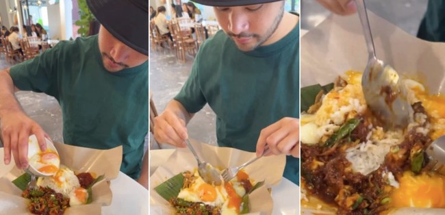 Ia juga mengatakan bahwa cara makan nasi lemak seperti ini adalah cara terbaik yang selalu dilakukannya. Ternyata aksinya menuang telur setengah matang justru menuai pro kontra dari netizen yang melihatnya.