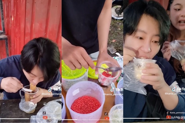 Kudapan pertama yang ia coba yaitu es teler yang terlihat segar. Ia pun terlihat sangat lahap menghabiskan es teler itu. Setelahnya, orang Korea ini mencicipi tahu gejrot yang dilanjutkan dengan minum air kelapa.