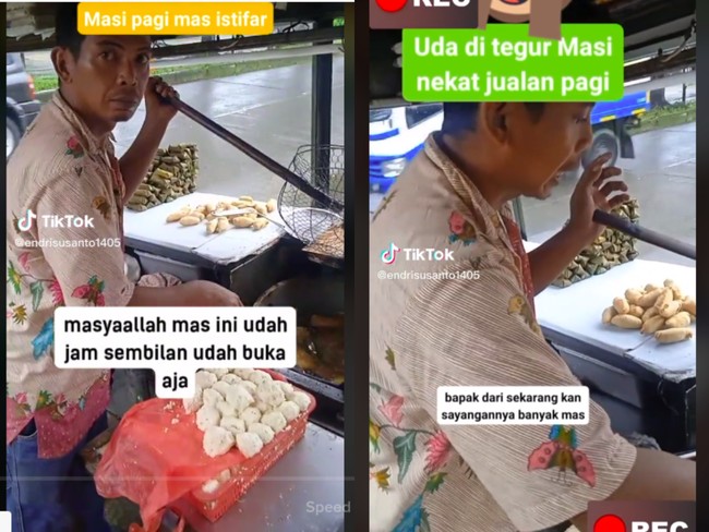 Dalam video tersebut terdengar seseorang berkata, "Masya Allah mas, ini baru jam 9 udah buka aja,". Hal tersebut membuat penjual gorengan menoleh dan terkejut mendengar perkataan tersebut.