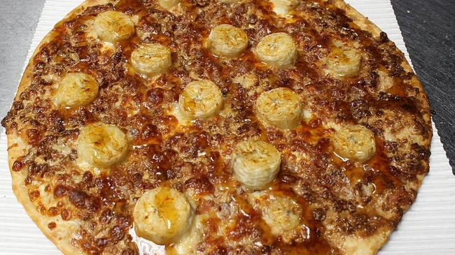 Jika biasanya pizza disajikan dengan topping gurih seperti peperoni dan mozzarella, pizza ini justru dioles selai kacang dan tambahan buah pisang.