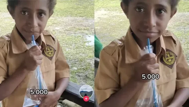 Seperti video seorang murid sekolah dasar di Papua, yang tengah jajan air putih di plastik untuk minuman. Anak itu jajan air putih di kantinnya, tanpa es batu dan tambahan lainnya. Video ini pertama kali diunggah oleh pemilik akun @efarista25.