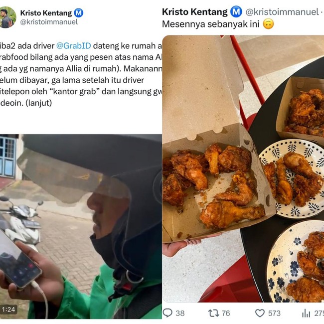 "Tiba2 ada driver @GrabID datang ke rumah antar grabfood bilang ada yang pesen atas nama Allia (ga ada yg namanya Allia di rumah). Makanannya belum dibayar, ga lama setelah itu driver ditelepon oleh 'kantor grab' dan langsung gw videoin," tulis keterangan Kristo di unggahan miliknya.