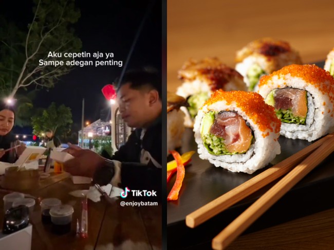 Seorang food vlogger yang eksis dengan akun TikTok @enjoybatam tengah asyik menikmati sushi di sebuah restoran. Ia ditemani dengan rekan wanitanya memilih tempat outdoor.