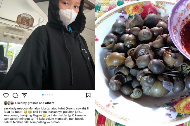 "Mahalan lobster atau tutut (keong sawah)?! Buat ku tutut! beli 11ribu, basiannya puluhan juta. Keracunan, berujung typus jadi dari sabtu tanggal 6 kemarin sampai sekarang Minggu tanggal 14 kala belum membaik, pun besok belum terlihat hilal bisa pulang ke rumah," curhat Zaskia Adya Mecca dalam unggahan fotonya.