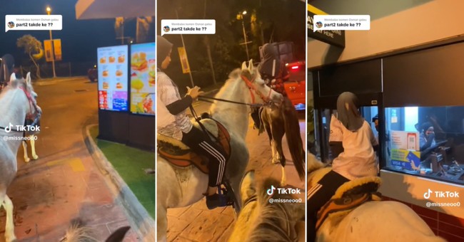 Tren pesan makanan via drive thru menggunakan kuda sudahada di Malaysia. Seperti aksi beberapa remaja yang pesan makanan dari atas kuda mereka.