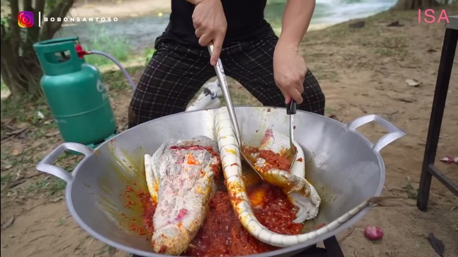 Setelah itu, ia memasukkan kaki, kepala, dan ekor buaya untuk ditumis dengan bumbu. Bagian tubuh buaya tersebut dimasukkan utuh, tanpa dipotong kecil-kecil.