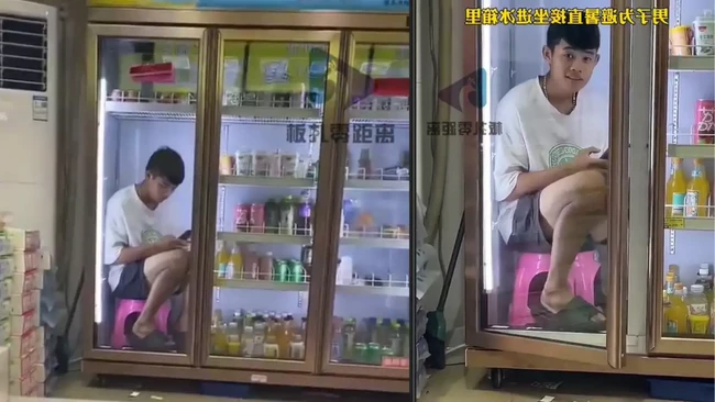 Suhu udaranya di China sangat panas. Remaja pria ini masuk ke dalam cooler atau kulkas besar berisi minuman untuk mendinginkan diri.