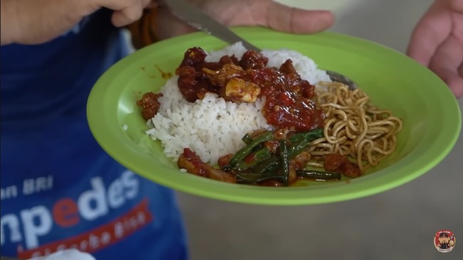 Nex Carlos memesan seporsi nasi dengan lauk daging. Sajiannya dilengkapi dengan lauk tumisan kacang panjang, mie goreng, dan sambal. YouTuber 4,7 juta ini sampai terkejut ketika hanya membayar Rp 3.000 saja.