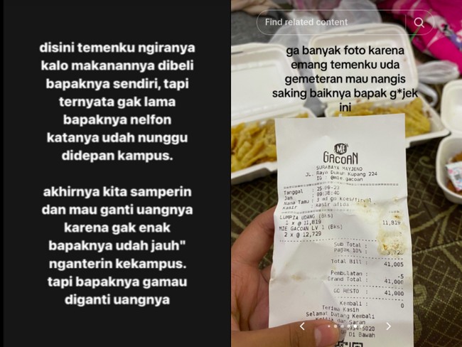 "Di sini ngiranya kalau makanannya dibeli bapaknya sendiri, tapi ternyata gak lama bapaknya nelpon katanya udah nunggu di depan kampus," ujarnya lebih lanjut.