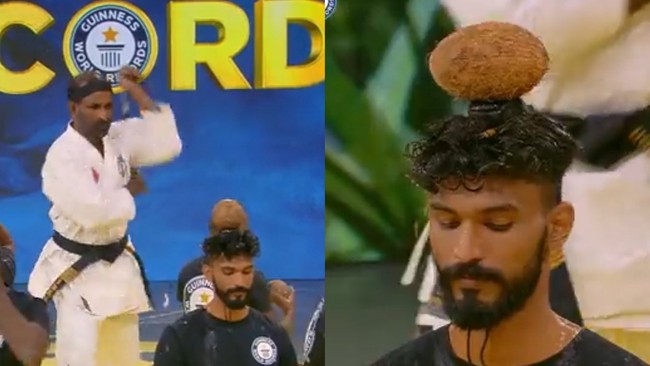 Saidalavi mengumpulkan 6 orang di sekelilingnya. Kelapa itu diletakkan di atas kepala masing-masing orang. Aksi Saidalavi tampak mencuri perhatian karena memukulkan nunchaku ke arah kelapa hingga pecah.