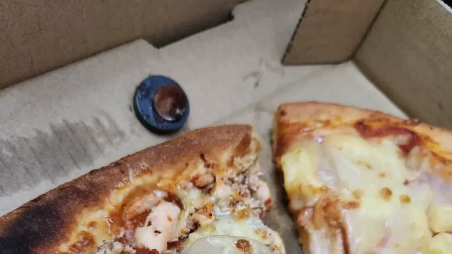 Tampilannya mirip dengan irisan buah zaitun, pria ini hampir saja menelan magnet besi yang ada di dalam pizza pesanannya.