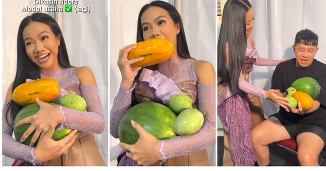 Terlihat ada semangka, sebuah pepaya, dan tiga buah mangga yang belum dikupas sehingga masih utuh. Tawanya menjelaskan bahwa Yura Yunita dan tim terkejut melihat buah-buahan yang disajikan untuk dirinya.