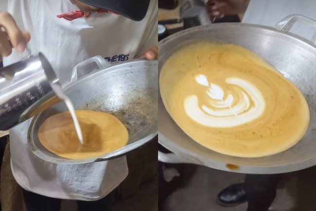 Belum lama ini, Frenky juga membuat latte art di dalam wajan. Frenky terlihat fokus ketika membentuk latte art tersebut.