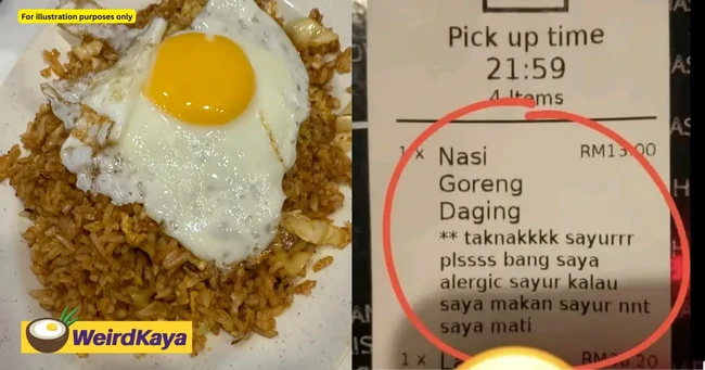 Seorang netizen yang bekerja di restoran membagikan foto pada akun Facebook bernama The Malaysian. Pesan kocak disoroti oleh Weird Kaya (29/11) yang tampak pada pesanan seporsi nasi goreng daging tersebut.