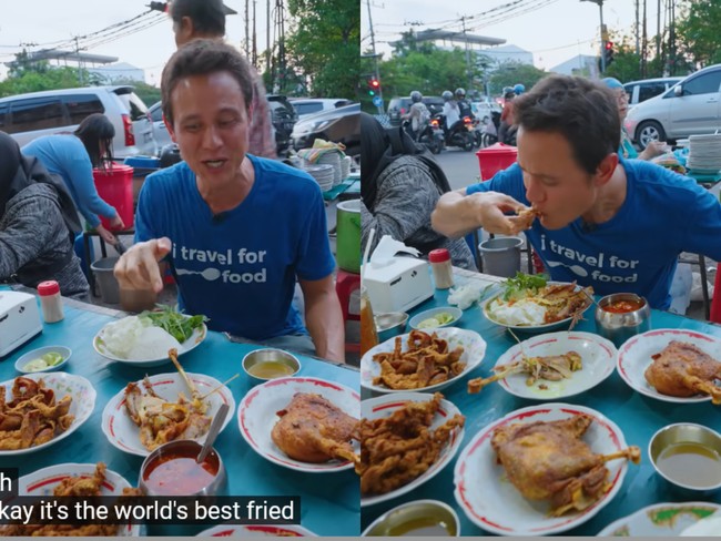 "Hm, wow! Ini adalah bebek goreng terbaik di dunia! Saya tidak pernah mencoba yang seperti ini sebelumnya. Bumbu rempahnya, kunyit, bawang merah, bawang putih, dan proses mereka memasak itu membuat bagian luar bebeknya garing tapi dalamnya masih juicy," jelasnya.