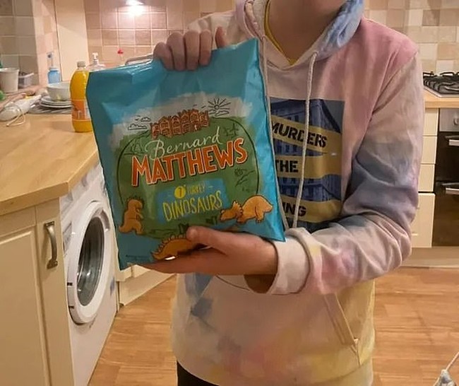 Ternyata kalkun yang dipesannya sudah habis di supermarket. Akhirnya pesanan yang dibeli secara online diganti dengan kalkun beku yang sudah diolah dan berbentuk dinosaurus.
