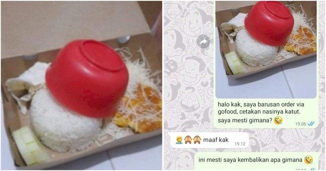 "Halo kak, saya barusan order (pesan) via G*f**d. Cetakan nasinya terbawa. Saya mesti gimana?" tulis pelanggan ayam geprek tersebut dalam pesan singkatnya.