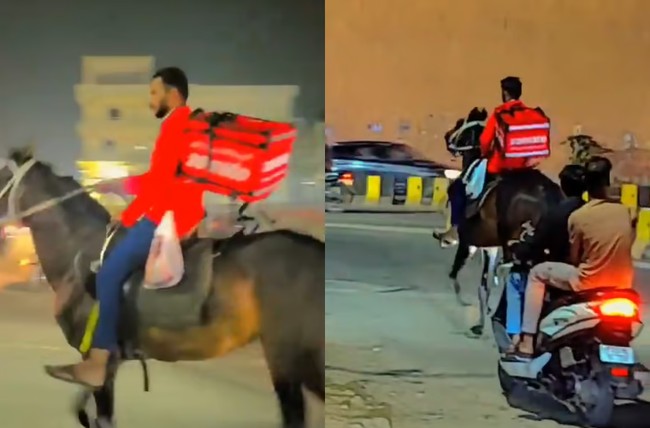 Mengenakan jaket bertuliskan Zomato, pengantar makanan itu tampak menunggangi seekor kuda sambil membawa kotak penyimpanan makanan. Pada bagian pinggang kirinya juga terlihat sebungkus makanan yang menggantung.