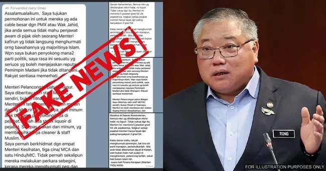 Menteri Pariwisata, Seni dan Kebudayaan Malaysia, Datuk Seri Tiong King Sing difitnah lewat pesan berantai di WhatsApp. Dalam pesan itu, ia dituduh mengonsumsi makanan dan minuman non halal.