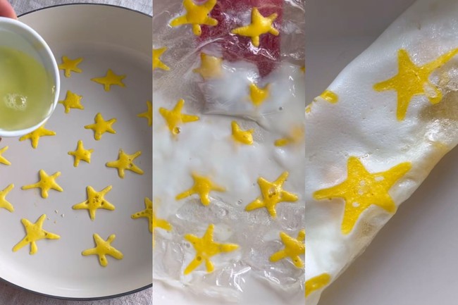 Jadi, bentuk bintang kecil-kecil terlebih dahulu di atas wajan anti lengket. Setelah matang, tuangkan putih telur kocok itu ke bagian atasnya.