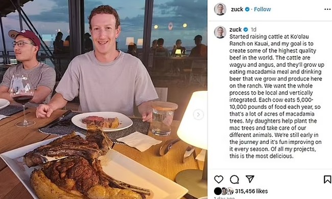 "Mulai beternak anak sapi di Ko'olau Ranch di Kauai, dan tujuan saya adalah menciptakan beberapa daging berkualitas terbaik di dunia," ungkap Zuckerberg pada kolom keterangan di akun Instagramnya.