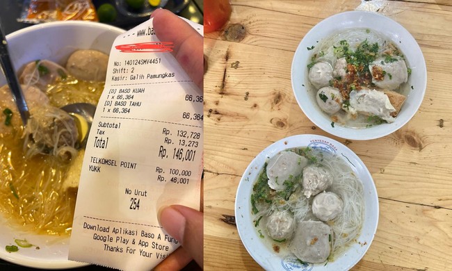 Di bon unggahannya, pengguna X tersebut memesan Baso Kuah (Rp 66.364) dan Baso Tahu (Rp 66.364). Totalnya dengan pajak, ia harus membayar Rp 146.001 untukdua mangkok bakso.