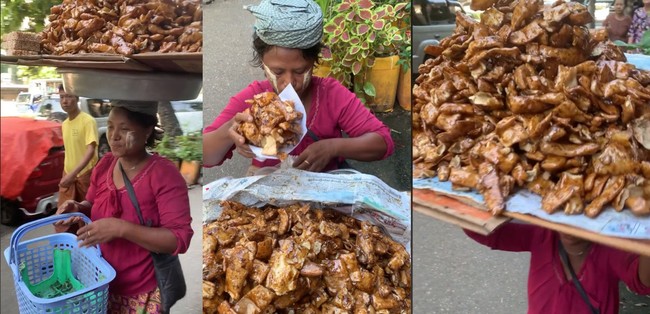 "Seorang wanita menjual camilan di atas kepalanya," tulis keterangan akun tersebut. Penjual ini sehari-harinya keliling di kawasan Yangon, Myanmar.