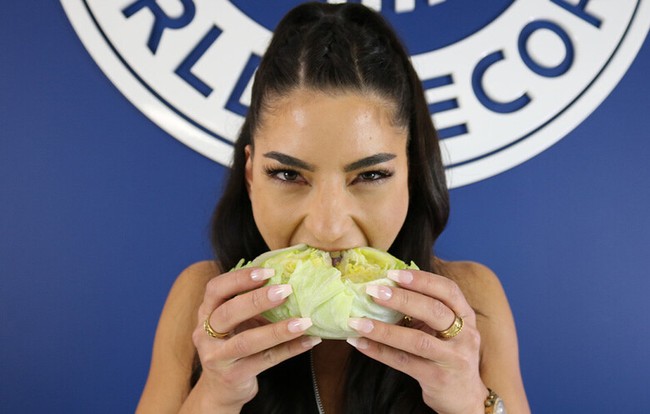 Selain menelan makanan terbanyak dalam 1 menit, Leah juga menantang dirinya untuk melahap suatu makanan dengan cepat. Kali ini pilihannya jatuh pada sebuah lettuce atau tanaman yang mirip selada dengan bentuk bulat yang besar.