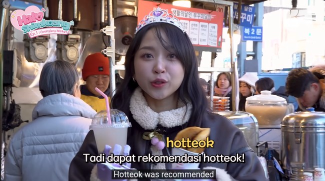 Pada momen kulinernya, Dita menghampiri sebuah warung. Warung itu menjual aneka makanan khas Korea, Dita membeli tteokbokki dan japchae.