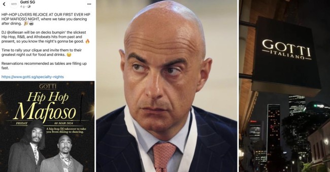 Mengutip Mothership SG (9/3/2024), Gotti Italiano adalah restoran Italia dan bar cocktail yang berlokasi di Amoy Street. Terbaru, restoran berusia 2 tahun ini membuat promosi di media sosial tentang acara yang mereka buat, Hip Hop Mafioso, pada 8 Maret 2024.