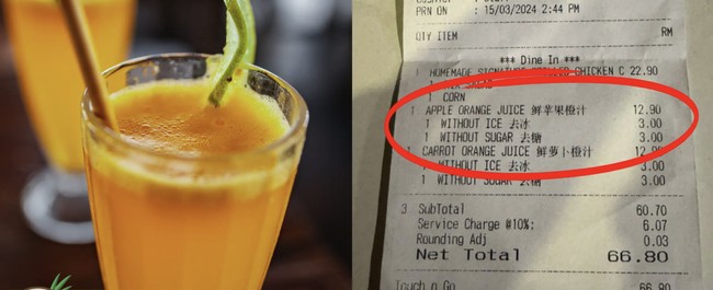 Ia minta pesanannya dibuat tanpa es dan tanpa gula. Kemudian ada biaya tambahan total RM 6 (Rp 20 ribu) untuk hal ini. Semuanya tercantum jelas di struk yang ia terima.