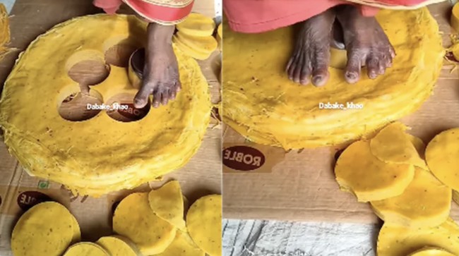 Video ini juga memperlihatkan bagaimana lembaran papad ditumpuk untuk dibentuk bulat-bulat. Caranya memakai cetakan baja bentuk bulat yang ditekan menggunakan kaki telanjang!