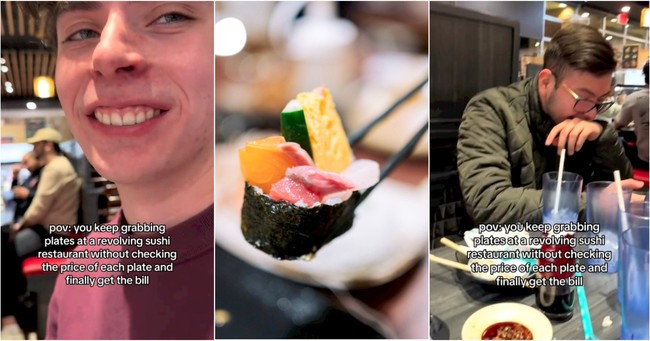 Unggahan video pada akun TikTok @leon.aa menarik perhatian Daily Dot (4/4) untuk mempublikasikannya. Tiga orang pria yang baru saja selesai makan di sebuah restoran sushi menampilkan mimik wajah yang terkejut.