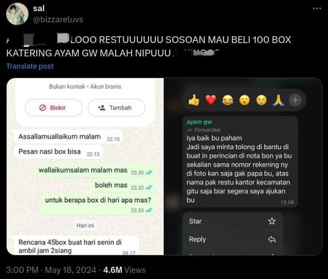 Seorang pengguna Twitter dengan akun @bizzareluvs (18/5) membagikan kejadian penipuan atas bisnis katering miliknya. Insidennya berawal dari seorang pria yang menghubunginya melalui WhatsApp mengaku bernama Restu dan merupakan perwakilan dari Kantor Kecamatan Pancoran.