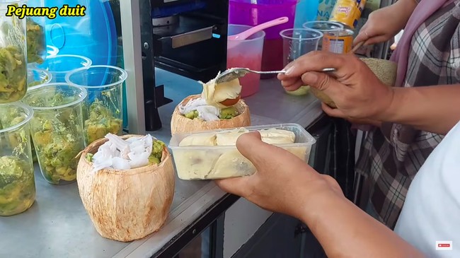 Seporsi es alpukat kocok jualannya dibanderol mulai Rp 13.000. Penyajiannya unik, menggunakan wadah batok kelapa. Isiannya ada mulai dari es batu, alpukat, kelapa muda, air kelapa, susu kental manis, dan durian.