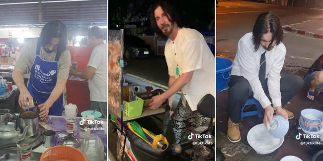 Pria di Thailand ini mencuri perhatian karena parasnya yang mirip dengan aktor Keanu Reeves. Ia terlihat berjualan kaki lima hingga menjadi pencuci piring.
