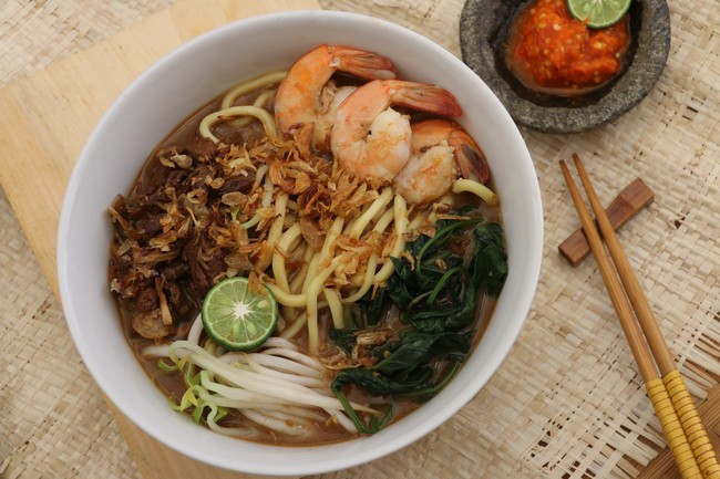 Kemudian, dilengkapi dengan tauge, potongan daging ayam kecap, udang, dan kuah kaldu berwarna cokelat kental. Kuah kaldu tersebut memiliki cita rasa gurih dan manis.