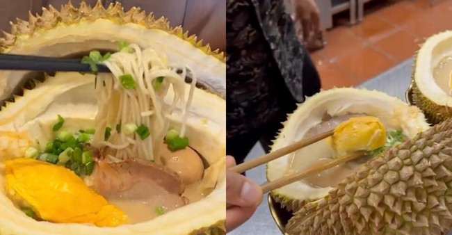 Buah durian itu berukuran besar dan di dalamnya telah tersaji seporsi ramen tonkotsu atau berkuah kaldu tulang babi yang kental creamy. Ramen durian ini juga diberikan topping irisan daging babi, daun bawang, dan ajitama (telur rebus Jepang).