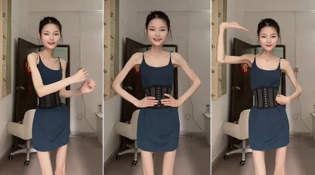 Saat di depan kamera, postur tubuh wanita asal Guangzhou ini terlihat sangat kecil. Paha dan lengannya seperti tinggal tulang saja. Bagian tulang bahunya juga amat menonjol karena ia terlalu kurus.